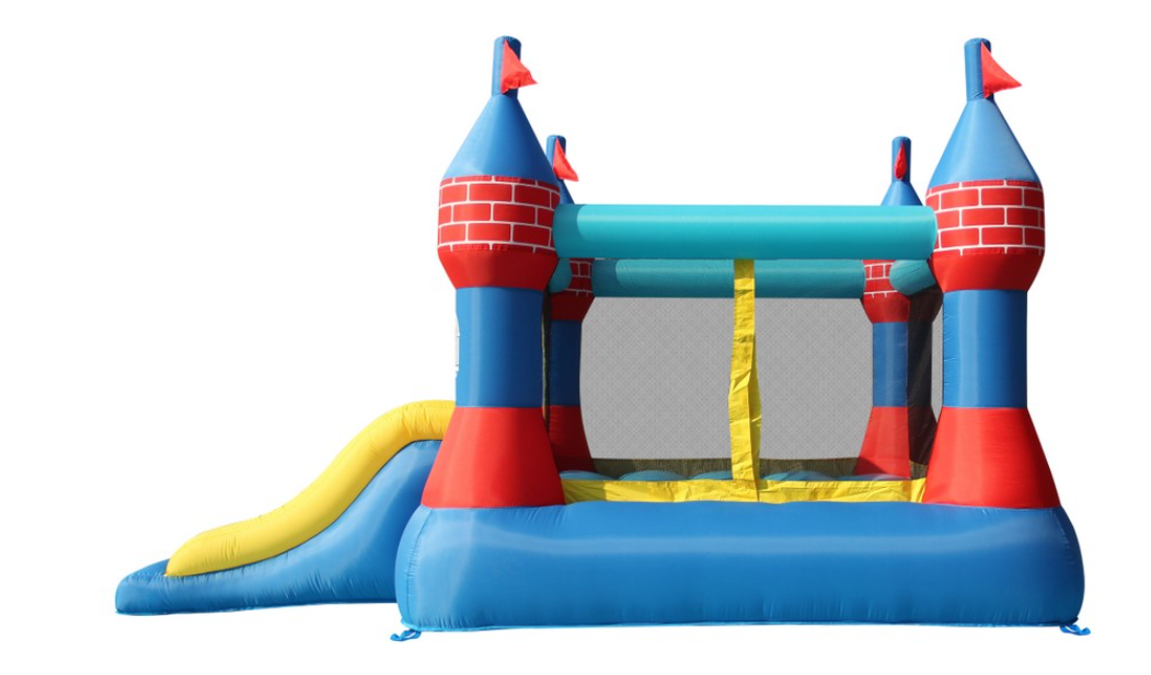 Castello, arricchito da un doppio scivolo, nuovi colori, superficie per saltare, e reti di protezione su tutti i lati, entrata laterale chiudibile con velcro.